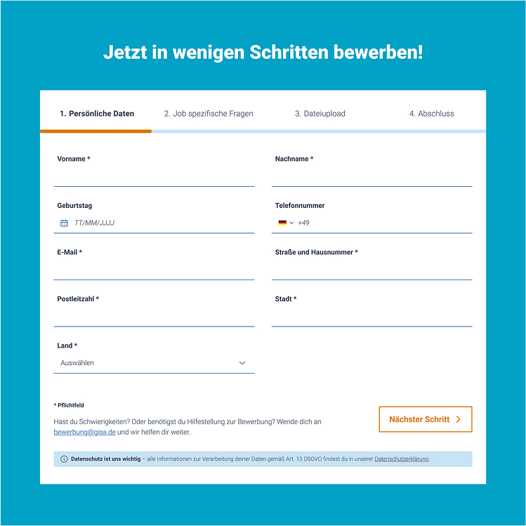Ob Kennenlernen, Gespräch oder Vertragsangebot – dein Weg ins Team GISA ist transparent und wertschätzend. Wir begleiten dich Schritt für Schritt und freuen uns darauf, dich bald persönlich willkommen zu heißen.